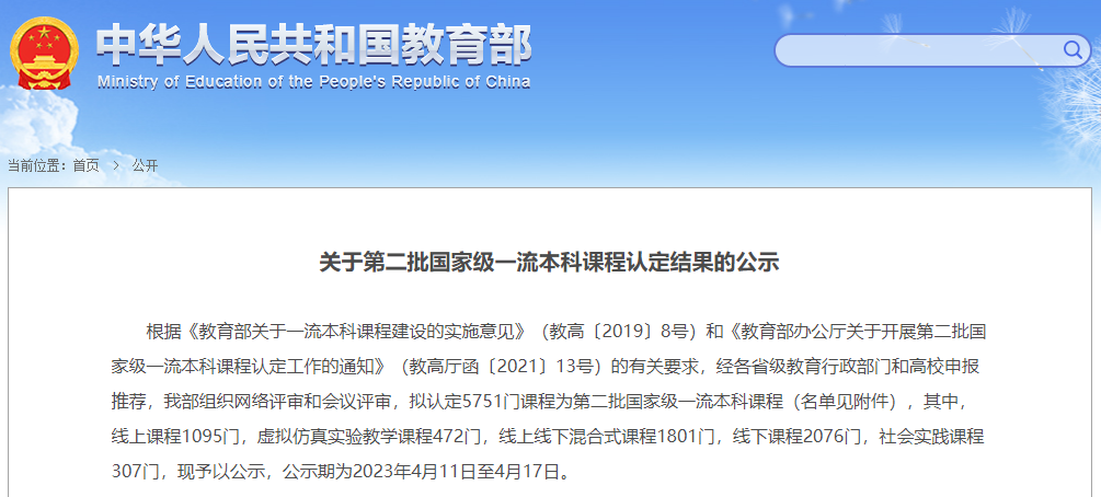 近日,教育部公示第二批国家级一流本科课程认定结果,拟认定5751门课程为第二批国家级一流本科课程,其中,线上课程1095门,虚拟仿真实验教学课程472门,线上线下混合式课程1801门,线下课程2076门,社会实践课程307门,公示期为2023年4月11日至4月17日。本次认定四川共有273门课程拟入选。